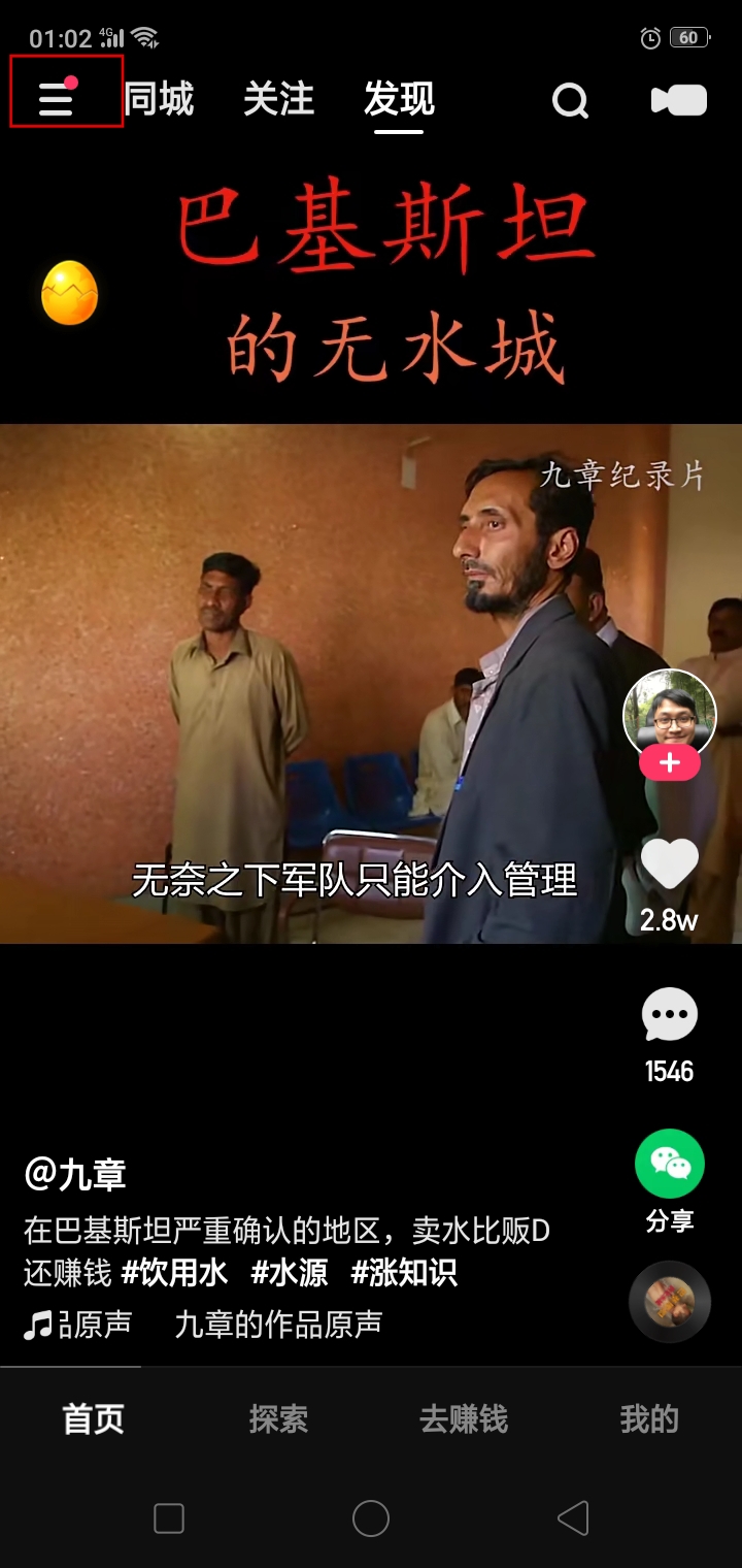 打开快手极速版重新扫一次二维码,点击首页左上角“三”,打开扫一扫