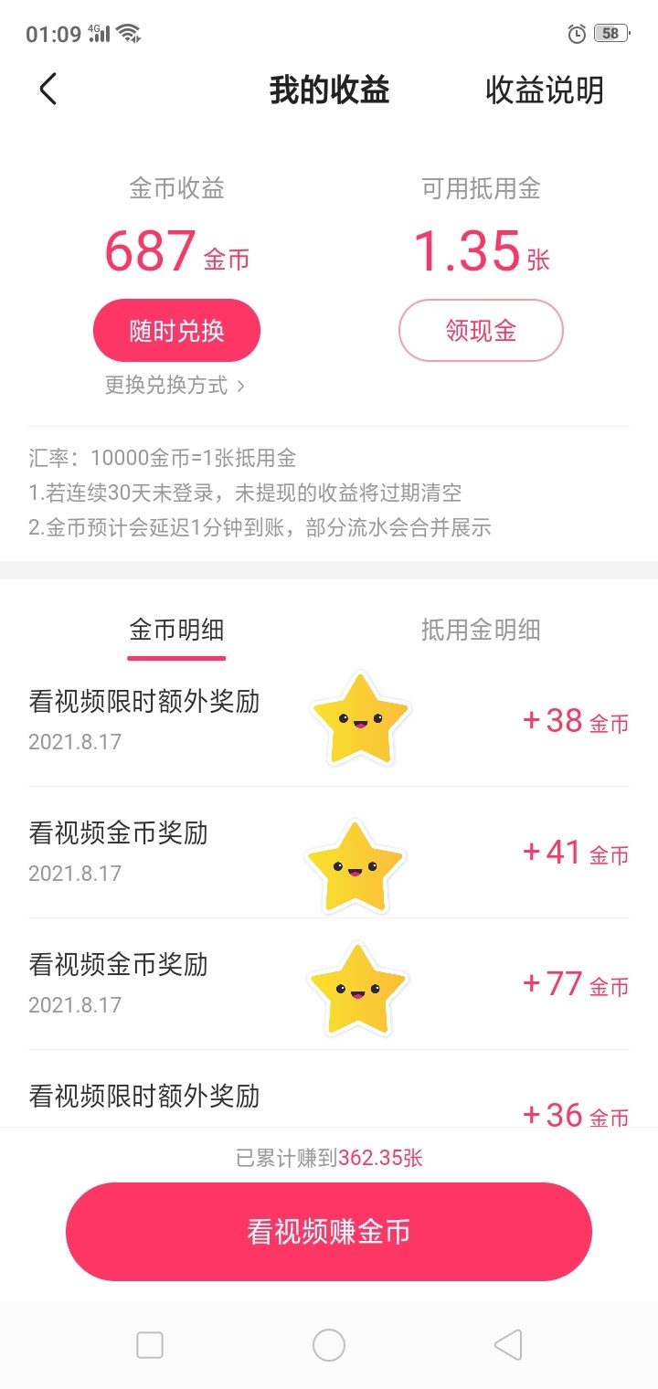 看1分钟视频,建议看到出现金蛋获得看视频额外奖励,点击去赚钱-我的金币-金币明细,包含至少2条看视频金币奖励和1条看视频限时额外奖励