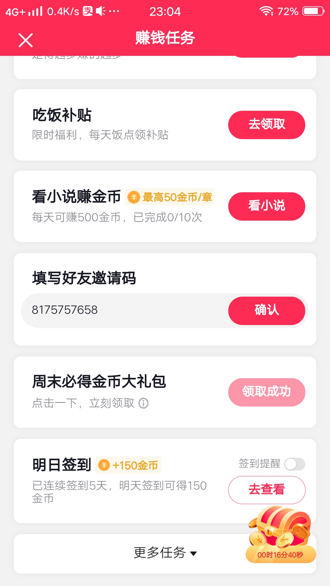 点击确认,现金收益有填写邀请码奖励,看视频超过两分钟,金币收益,必须包含任务当日看视频福利