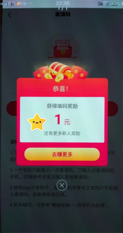 点击马上提交,提示“获得填码奖励”字样