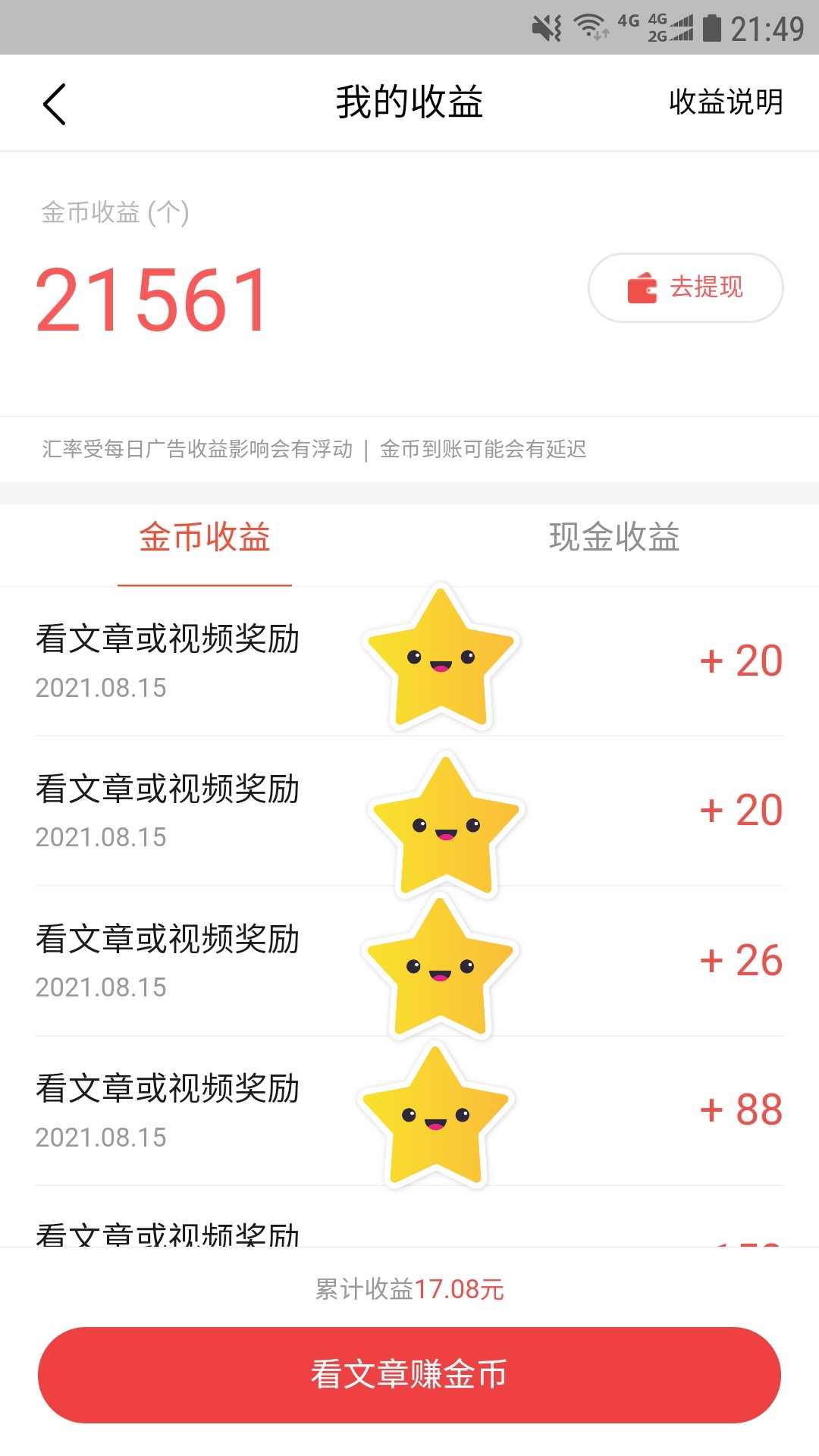 阅读文章或看视频获得3条金币收益记录,点击我的-收入记录-我的收益-金币收益,需要有3条以上看文章或视频奖励。
