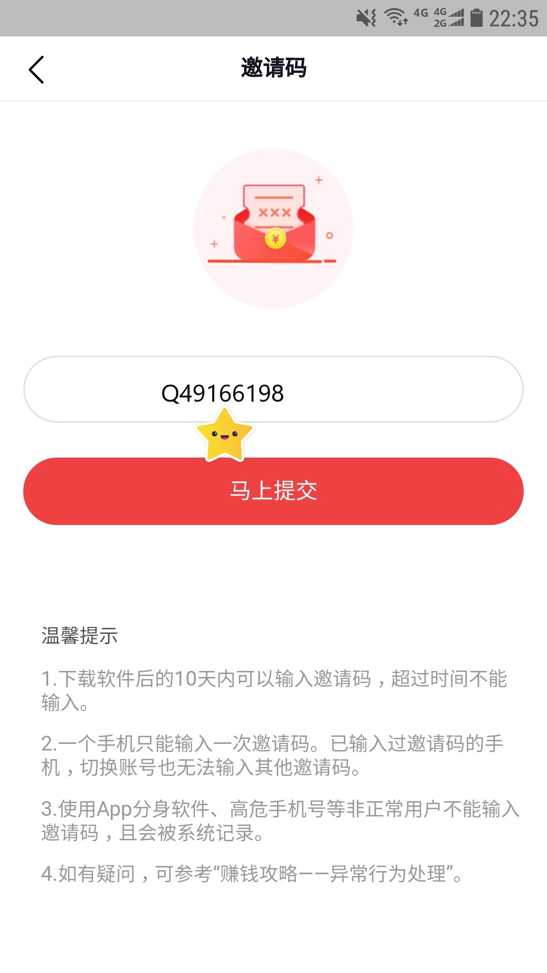 任务页面, 填写邀请码【Q49166198】,或者复制口令