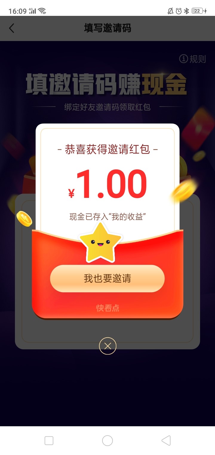 点击打开红包,提示信息“恭喜获得邀请红包¥1.00,现金已存入我的收益”字样