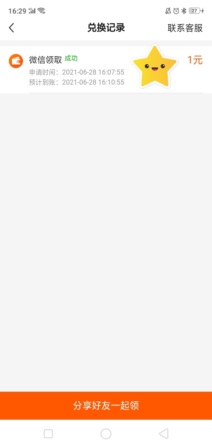 完成提现,点击福利-总金币-领现金-领取记录,提现日期必须是当日